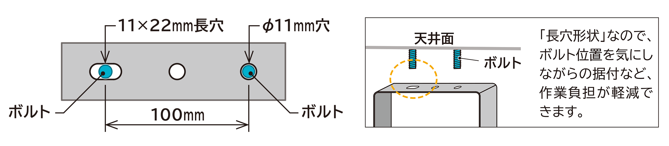 取付穴は、微調整が可能な「長穴形状」を採用。
