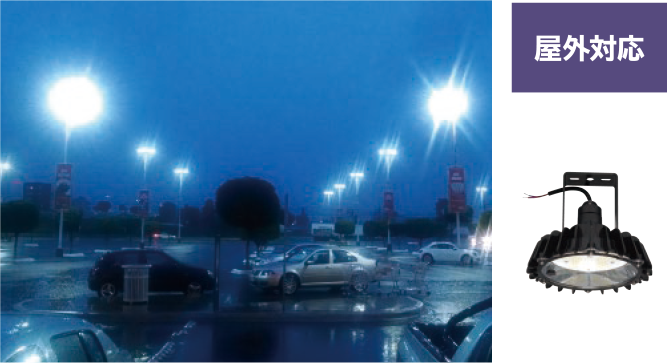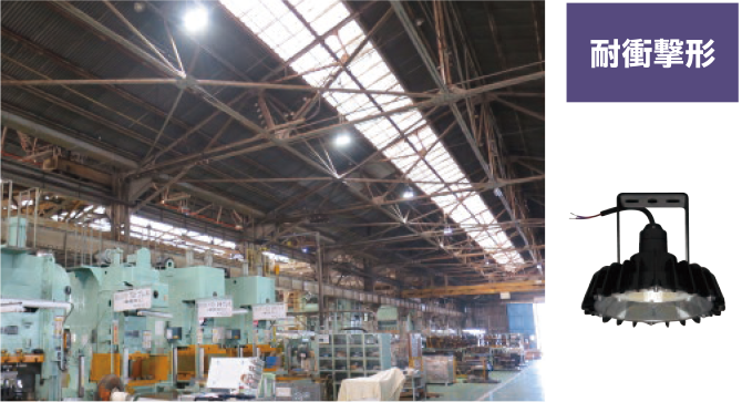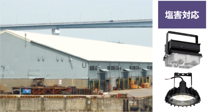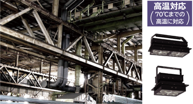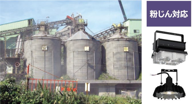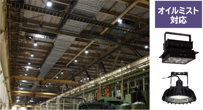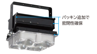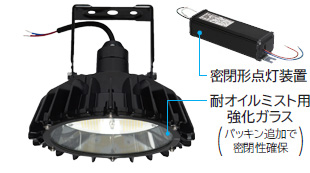 オイルミスト(油飛沫)や粉じんの舞う工場、沿岸地域など特殊な環境での使用(設置)に耐えるため、器具または点灯装置内部に水やほこり等の侵入を防ぐ構造になっています。