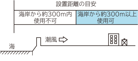 海岸から約300m以上離れた地域に設置してください。